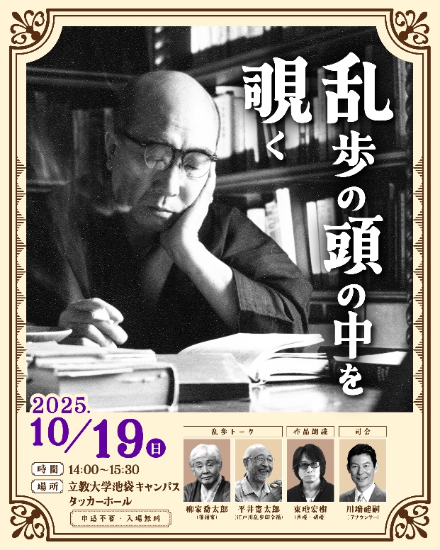 現在、立教大学が管理する旧江戸川乱歩邸の土蔵には、乱歩が蒐集した本が今も収められ、作家の思考のかけらが残されています。その土蔵を手掛かりに、乱歩のご令孫・平井憲太郎さん(昭48法)と落語家・柳家喬太郎師匠が、作家として、そして人としての乱歩を語り合います。さらに声優・東地宏樹さんによる「人間椅子」朗読も。MCには川端健嗣さん(昭59営)を迎え、乱歩の頭の中をのぞき込むような、一日限りの特別トークイベントをお届けします。